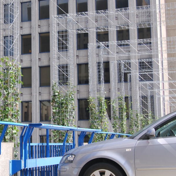 De geabstraheerde bomen zijn opgetrokken uit gaaskorfelementen met klimplanten en staan symbool voor het groene gevelsysteem dat Greenface onlangs in de markt heeft gezet. 25 m2 van dit gevelsysteem staat namelijk gelijk aan het planten van een volwassen boom, als het gaat om fijnstoffiltering. Daarmee is het systeem ideaal om zowel bestaande bouw als nieuwbouw in dichtbebouwde omgevingen te voorzien van een groen jasje en daarmee het leefklimaat te verbeteren. Zo is onlangs project Greenpark, de parkeergarage Westblaak volledig voorzien van het Greenface-systeem. zie www.greenpark.nu